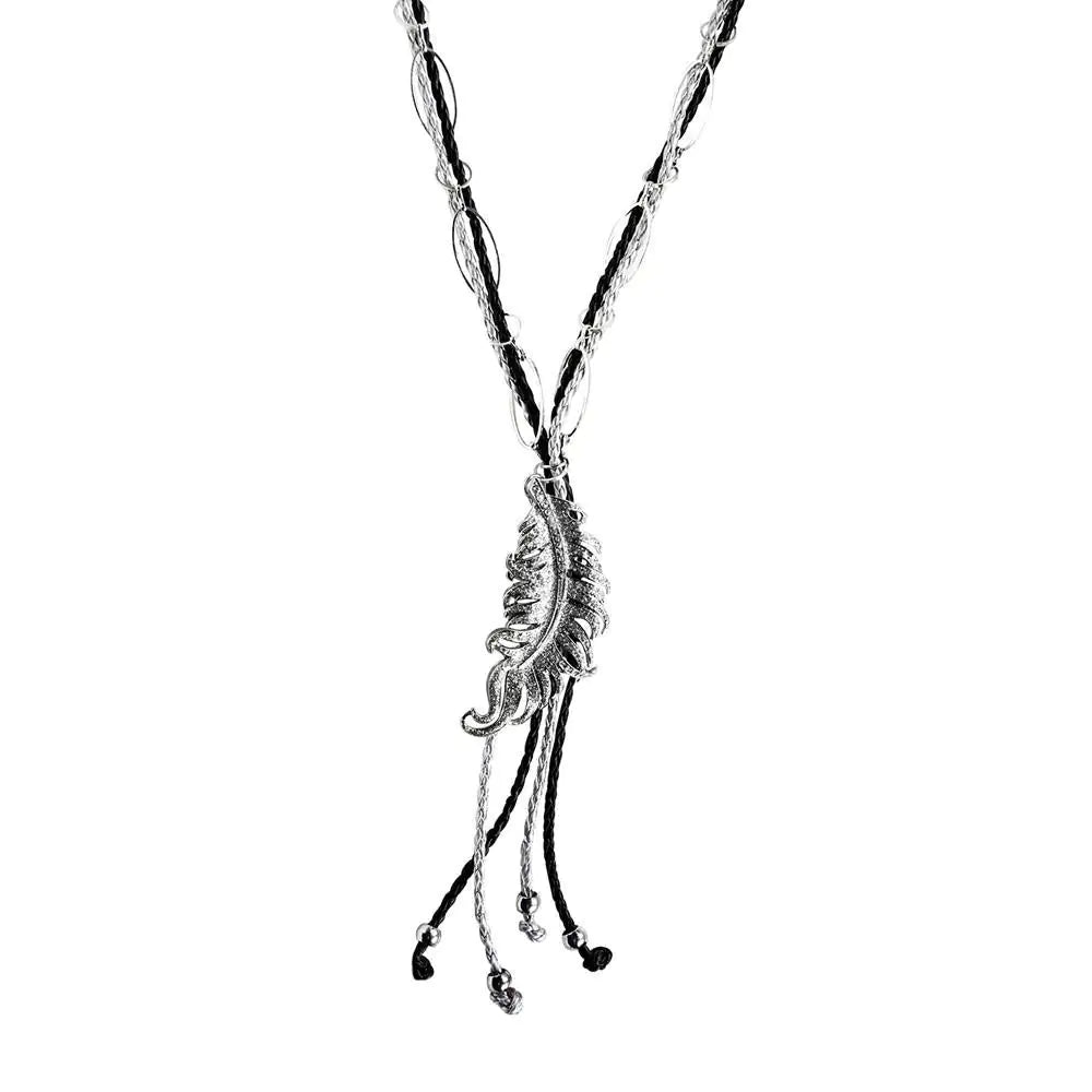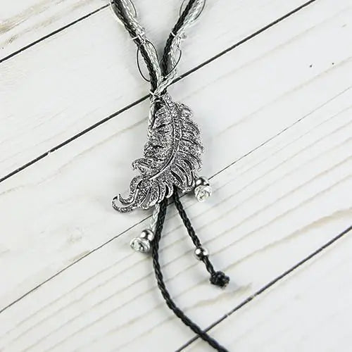 The shimmering rhinestone feather central piece shines bright, anchored on a combination of chain and leather, making this necklace a beautiful add-on accessory.