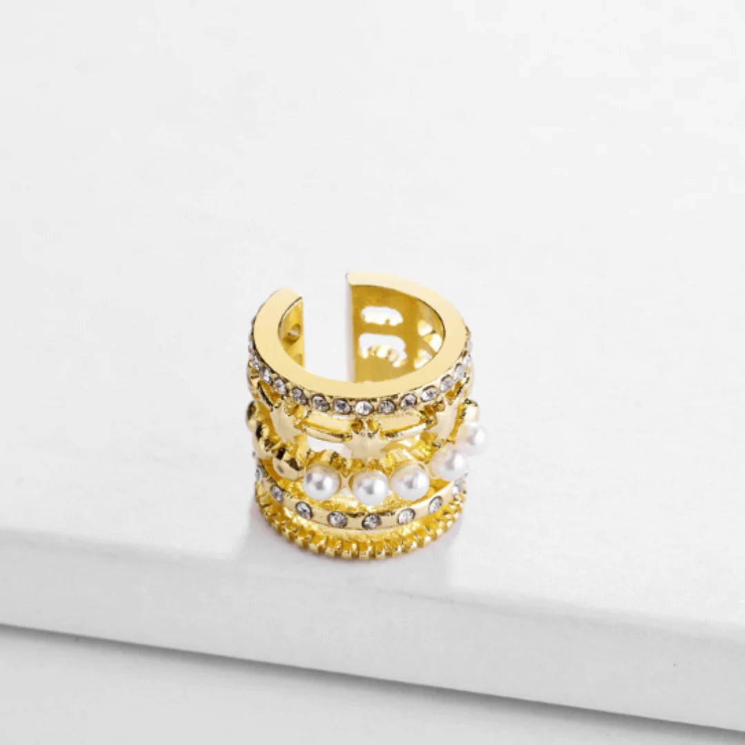 Tia is a delicate ear cuff featuring rows of gold in various textures, rhinestones and freshwater pearls.